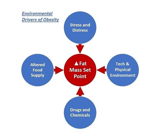 Obesity researchers know that obesity results from the effects of environmental triggers on genetically susceptible individuals. These triggers are many but may be grouped into four categories: