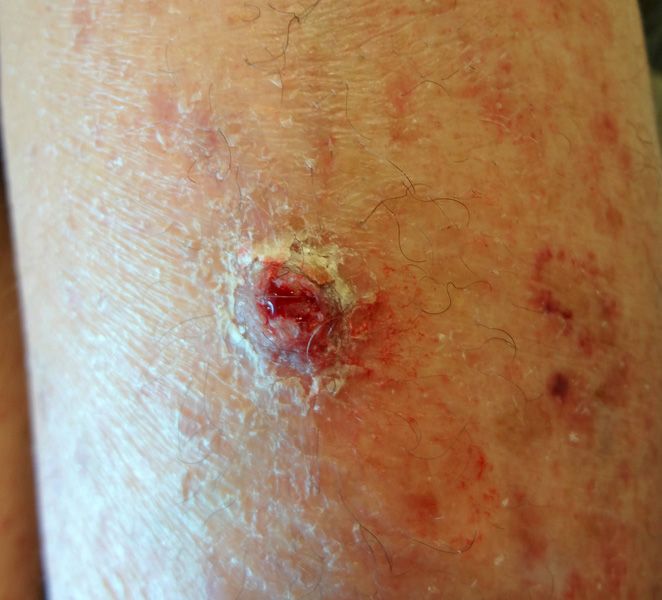 An 88-year-old woman sought care for a nodule on the anterior surface of her left foreleg that had developed gradually. An exophytic nodule with ulceration and some element of surface hyperkeratosis in a geriatric patient is almost always malignant. A biopsy in this case disclosed a deeply invasive diagnosis.