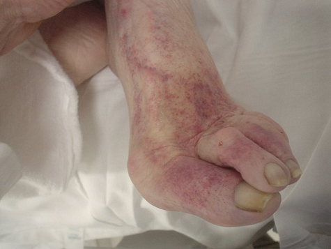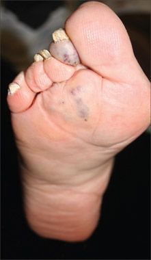 Nursing staff noted a blue second toe on the right foot of a 77-year-old woman being treated for complications of dementia. She had had aortic problems and atrial fibrillation. Manual separation emphasizes dissemination of irregular purple discoloration onto the sole just proximal to the blue toe. Prominent warty keratosis is seen on the inferior surface of the second toe and keratinous debris on the third toe and in a 1-cm-deep “trench” just before the smaller toes separate.