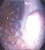 A 92-year-old woman presents with sharp abdominal pain of 1 day's duration, accompanied by an episode of emesis. The pain is neither relieved nor exacerbated by food ingestion. She has chronic mild dyspepsia, with a distant history of peptic ulcer disease; congestive heart failure; and chronic obstructive pulmonary disease. An upper GI endoscopy image is shown here.