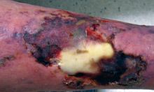 An 88-year-old man presented with a nonhealing ulcer on his right lower limb. The lesions started as multiple red nodules and became ulcerated and painful. He had extensive necrotic ulceration of his shin, covered by black hemorrhagic crust. A 3-mm punch biopsy showed “benign ulceration”; an arteriogram showed calcification of the profunda femoris and superficial femoral arteries. His condition is most often found with chronic renal disease and secondary hyperparathyroidism.