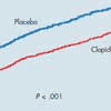 Clopidogrel. Clopidogrel belongs to the thienopyridine class of drugs, which inhibit platelet aggregation by antagonizing adenosine 5'-diphosphate (ADP) receptors. In the CURE trial (acronyms for all trials mentioned in this article are expanded in the Box), 12,562 patients were randomized to receive either clopidogrel/aspirin (loading dose of clopidogrel, 300 mg, followed by 75 mg/d) or placebo/aspirin. The initial dose was given within 12 hours of presentation for NSTEMI, and treatment was continued for a minimum of 3 months (mean duration of treatment, 9 months). Treatment with clopidogrel and aspirin was associated with a 20% reduction in the relative risk of the primary composite end point of cardiovascular death, myocardial infarction (MI), or stroke. Benefit was seen as early as 2 hours after initiation of treatment, and patients continued to derive benefit from the treatment throughout the 12-month follow-up period (Figure 2). There was a statistically significant increase in major bleeding in the clopidogrel treatment group, but the overall rate was low (3.7% vs 2.7% in the placebo group; P = .001).3