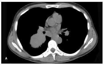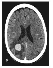 Figure 1. Chest CT scan showing a right infrahilar mass (A) and head CT scan showing brain metastases in a 58-year-old, HIV-infected male smoker in whom small-cell lung cancer was diagnosed.