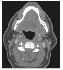 Figure 3. Neck CT scan showing a left tonsillar fossa mass (dashed lines) in a 57-year-old HIV-infected man with invasive squamous cell carcinoma.