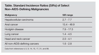Much has been written about the increase in non–AIDS-defining cancers in HIV-infected persons over the past decade.1-8 It is now clear that cancers other than AIDS-defining malignancies (non-Hodgkin lymphoma, Kaposi sarcoma, and cervical cancer) contribute to significant morbidity and mortality in the HIV-infected community. Non–AIDS-defining cancer was identified as the third leading cause of non-HIV-related death in New York City, accounting for 20% of all deaths.1 Although much of the available data is conflicting, non–AIDS-defining cancers likely occur in HIV-infected persons at twice the rate that they occur in the HIV-negative population, even at higher CD4 counts.2-4,9