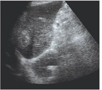 Figure 2. Abdominal ultrasonogram showing a mass (marked area) in the left lobe of the liver in an HIV/hepatitis C virus-coinfected man with hepatocellular carcinoma.
