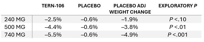 Once-daily oral TERNS-601 was associated with a significant mean 5% weight reduction after 28 days and had a favorable tolerability profile.