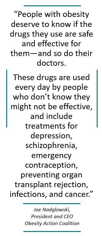 The Obesity Action Coalition, The Obesity Society, Stop Obesity Alliance, Obesity Medicine Association, and American Society for Metabolic and Bariatric Surgery said in the statement that individuals of higher body weights are routinely excluded from participating in clinical trials even though it is well known that body composition can materially alter pharmacokinetics. The result is “general population dosing instructions [that are] unsafe and/or ineffective for people with obesity” who now comprise 42% of the US adult population.