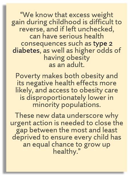 “We know that excess weight gain during childhood is difficult to reverse, and if left unchecked, can have serious health consequences such as type 2 diabetes, as well as higher odds of having obesity as an adult," she continued. "Poverty makes both obesity and its negative health effects more likely, and access to obesity care is disproportionately lower in minority populations. These new data underscore why urgent action is needed to close the gap between the most and least deprived to ensure every child has an equal chance to grow up healthy.”