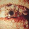 The dark-brown Lisch nodules in the iris and small neurofibromata in the adnexa surrounding the eye are typical of neurofibromatosis-1, or NF-1 (OMIM #166200). Other associated findings are multiple caf-au-lait spots with smooth (coast of California) borders that distinguish them from less specific coffee-colored spots with ragged (coast of Maine) borders seen in disorders such as McCune-Albright syndrome (OMIM #174800). A survey in Michigan proposed a diagnostic criterion of 6 caf-au-lait spots greater than 1.5 cm; this criterion applies only to adults because the spots develop during the first 4 years of life, arising as purplish, frequently pruritic blotches.1 Axillary or inguinal freckling and skeletal complications, such as scoliosis or pseudoarthrosis, can also occur.