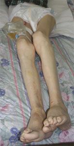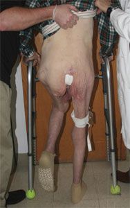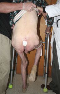 Frail man sitting in a wheelchair. Severe bilateral wasting throughout the lower limbs comprising both cachexia [weight, 105 lb (47.5 kg)] and disuse atrophy. Left leg held in adducted position. Surgical scar well-healed. Muscle stretch reflexes symmetrical. Confused but socially gracious and altruistic. Not hostile or manipulative in talking about his weight and his lack of desire to eat, about which he communicates only that no foods here appeal to him.