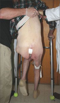 Like so many other complex frail elders, this patient experienced diverse impediments to neuromuscular integrity and balance over and above deconditioning and nerve injury, eg, foot disorders, venous insufficiency, sarcopenia, the asymmetrical external weighting of a leg bag for urine collection, and the discomfiture of the urethral catheter in addition to a coccygeal pressure sore (Figures 3and 4).