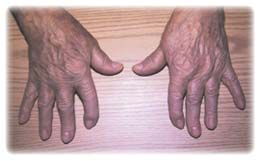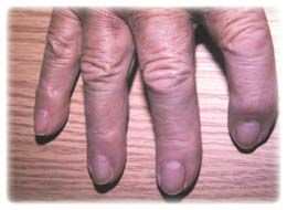 Several "What's Your Diagnosis?" columns have addressed RA in the hands.2,5-7 There is no single feature pathognomonic of rheumatoid hand; the most suggestive features include major metacarpophalangeal joint involvement and joint disease that is much more significant in the proximal interphalangeal joints than in the distal. In the present case, the abnormalities do not include a "knuckle sign." Apart from the thumbs, there is not even a forme fruste of the opera glass deformity of arthritis mutilans,7 which is most typically rheumatoid although reported in other conditions as well. Ulnar deviation of the digits is often cited as evidence for RA, but it can occur in plain osteoarthrosis as well.
