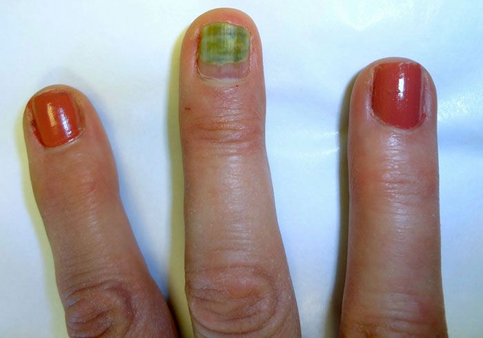 A 54-year-old woman sought medical attention after the appearance of a green fingernail.
