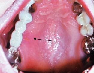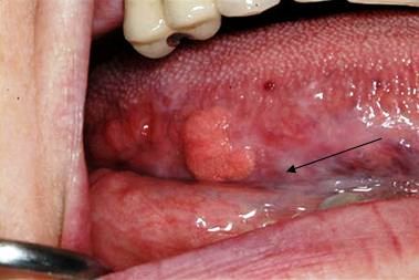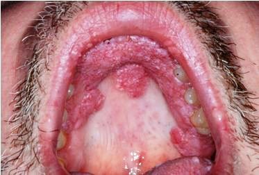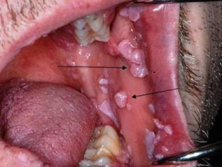 The HPV lesions seen here involve the hard and soft palate. Lesions typically occur at the lip commissures and on the dorsal tongue may also occur on the gingiva, floor of the mouth, lip, buccal mucosa, and tonsillar pillars.