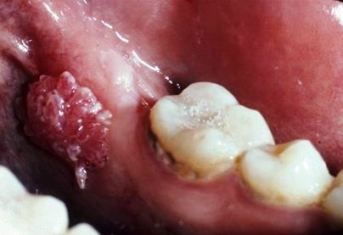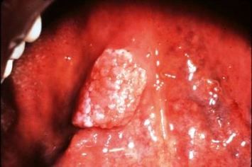 The lesion seen here, caused by HPV-16, is a papillary squamous cell carcinoma in situ. HPV-16 is highly associated with this orophayrngeal cancer and premalignant diseases.1-3 It is currently the primary cause of oral cancer in men.
