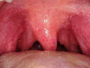 Primary HSV-1 lesions on the uvula and tonsillar pillars.