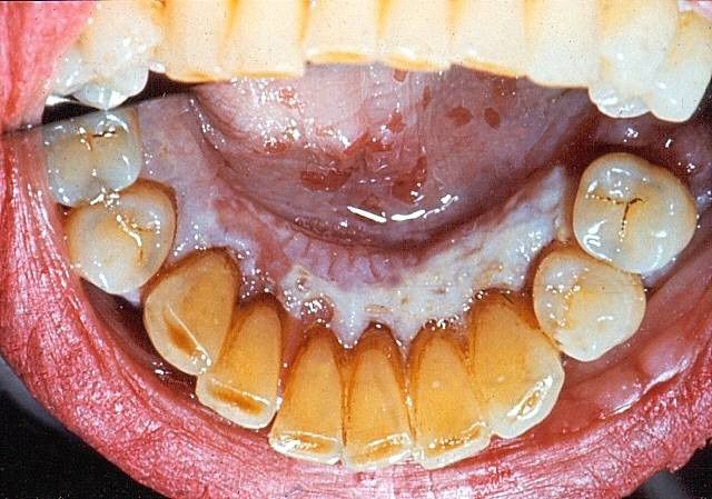 Key point: Areas of white mucosal discoloration were found throughout the gingival surfaces and the undersurface of the tongue. Scattered small erosions were also present. A biopsy of a 2-mm specimen confirmed the suspected diagnosis of oral lichen planus and excluded leukoplakia.