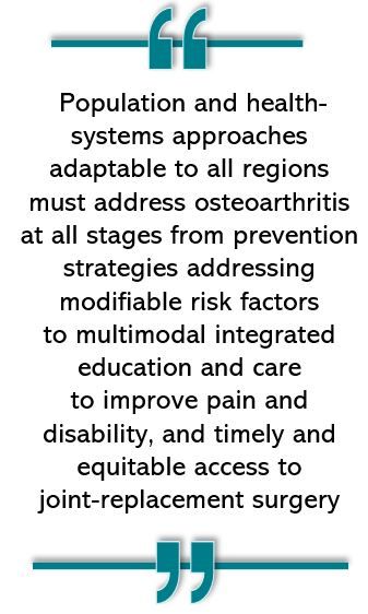 “Because there is no known cure for osteoarthritis and no proven structure-modifying interventions, this burden represents a major challenge to health systems. Population and health-systems approaches adaptable to all regions must address osteoarthritis at all stages from prevention strategies addressing modifiable risk factors to multimodal integrated education and care to improve pain and disability, and timely and equitable access to joint-replacement surgery,” the investigators concluded.