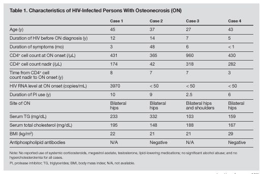 None of our patients possessed these reported risk factors for osteonecrosis in HIV infection, except for one who had mild hypertriglyceridemia; however, all had a prolonged duration of HIV infection and exposure to antiretroviral therapy, particularly to PIs (Table 1).