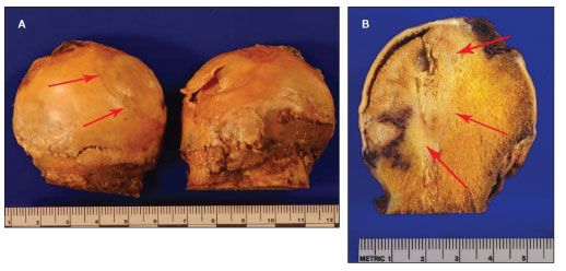 Figure 2. Surgical pathology (femoral head of patient described in Case 4) showing slightly depressed articular surface (A) and crescent-shaped area of infarction at epiphyseal and subarticular regions in cross-section (B).
