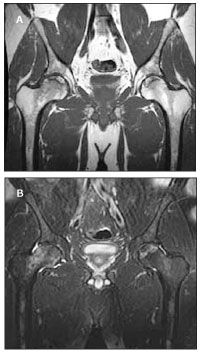 One year later, findings on repeated hip radiographs were normal, but repeated MRI scans showed bilateral osteonecrosis of the femoral heads. The patient became wheelchair-bound because of his excruciating pain despite narcotic analgesic use. A right total hip replacement and left hip core decompression were performed to control his pain after continued disease progression. One year later, after pain persisted in his left hip, a left total hip replacement was performed, with successful results. His CD4+ cell count nadir was 42/µL (4%) reported 7 years before the onset of symptoms. The patient had mild hypertriglyceridemia but no other identifiable risk factors for osteonecrosis. He had taken a PI for 9 years.
