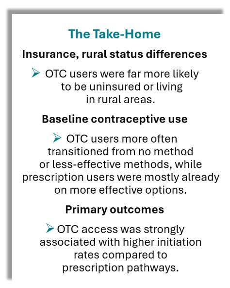 Among the study's limitations, the authors acknowledged that self-selection into OTC vs prescription pathways may reflect unmeasured differences in health care engagement or contraceptive preferences. In addition, the cross-sectional design limited ability to assess long-term outcomes such as continuation and unintended pregnancy rates. They pointed out, also, that the study data were collected early in the roll-out of the OTC pill, so uptake patterns may evolve with time.