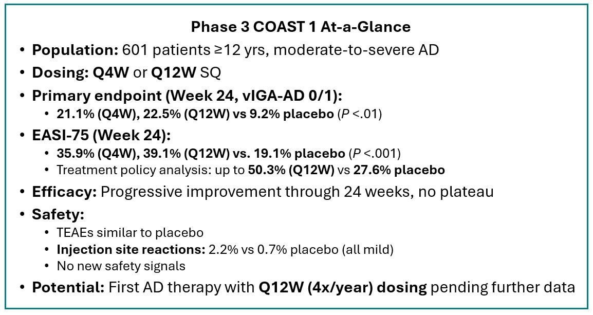 COAST 1 also achieved key secondary endpoints after 24 weeks of treatment, including the proportion of participants who achieved a vIGA-AD 0/1 with barely perceptible erythema and a reduction from baseline of 2 points or more, and the proportion who achieved a 4-point or greater reduction in peak pruritus-numerical rating scale (PP-NRS) from baseline in patients with a baseline PP-NRS of 4 or more.