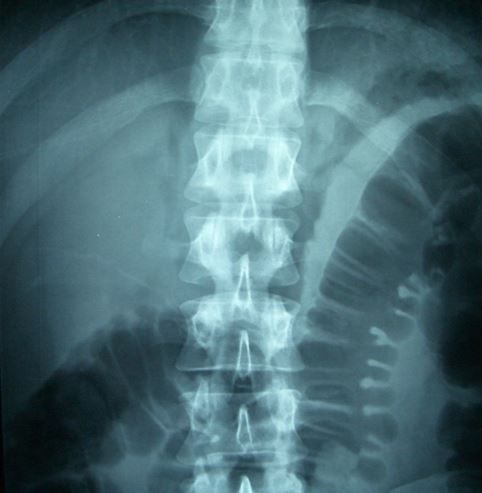 On spinal films, the lateral view findings are normal. The anteroposterior view is shown here. There is a fracture of the right lateral spinal process or the first lumbar vertebra.