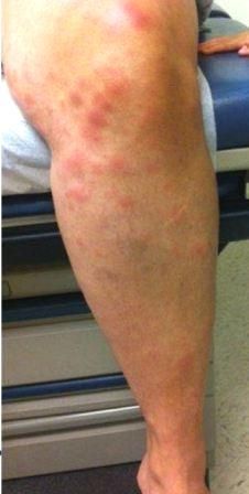 A 33-year-old woman complained of frontotemporal headaches and neck pain without stiffness. Later, she presented with a worsening headache and nausea, vomiting, ankle pain with swelling, and fevers. A new rash appeared as erythematous, tender patches on the anterior aspect of her lower extremities. She returned with new-onset diffuse chest pain, abdominal pain, and worsening headache. Biopsy of lung tissue was significant for granulomatous disease.