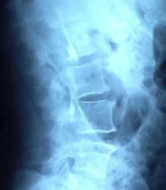 A 46-year-old man with a history of HIV infection presented with left flank pain. A lateral x-ray film of his lumbar spine shows erosion of the anterior vertebral end plates both above and below the involved disc space, consistent with discitis.