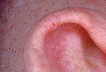 A 40-year-old man complained about a severely painful bump on his ear. He had trouble sleeping on that side because of the pain that occurred when he laid his head (and ear) down on the pillow. He had not had skin cancer and did not wear a helmet at work or during recreation.