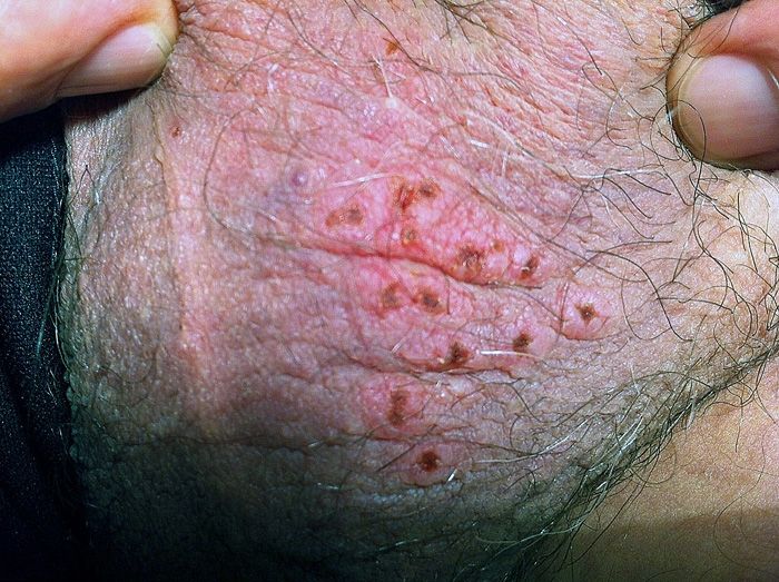 A 54-year-old traveling salesman sought medical attention for the acute onset of a painful scrotal rash. He had never experienced anything similar. Examination revealed grouped, crusted erosions on the scrotal skin. He also had ipsilateral, tender inguinal adenopathy.