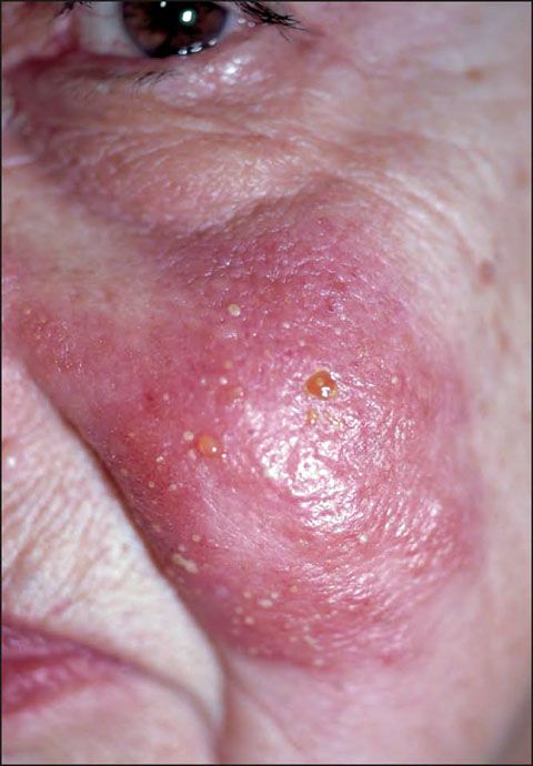 For 5 days, a 68-year-old woman has been bothered by a painful swelling on her left cheek. There is no history of trauma or bite. She takes a diuretic for mild hypertension. Amoxicillin/clavulanate was started 2 days earlier pending the results of a bacterial culture.
