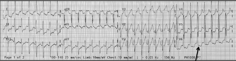 Figure 3. Retrograde P wave seen at arrow in lead V6.