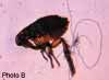 Photo B shows the cat flea, Ctenocephalides felis. Other common environmental fleas include the human flea (Pulex irritans), the dog flea (Ctenocephalides canis), the mouse flea (Leptopsylla segnis), and the rat flea (Xenopsylla cheopis).