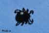 Photo A depicts a non-engorged tick. Common pathogenic soft ticks include the wood tick (Dermacentor andersoni- pictured here), dog tick (Dermacentor variabilis), and Lone Star tick (Amblyomma americanum). Note the presence of 8 legs, which place the organism in the arachnid group (rather than with flies, beetles, and other organisms of the insect group, all of which have 6 legs). The causative organism of tularemia is transmitted to humans either by contact with rabbits or hares or by contact with deerflies and ticks that infest deer in the forest.
