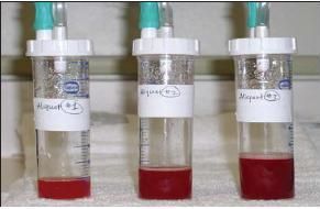 Figure 3 – Progressively bloody aliquots were obtained on 3 consecutive bronchoalveolar lavages in the lingula area.