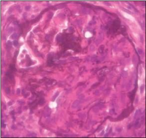Figure 4 – This renal biopsy specimen shows findings consistent with a pauci-immune crescentic glomerulonephritis.