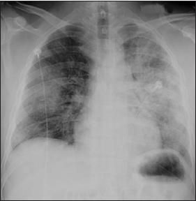 Figure 1 – Diffuse bilateral patchy infiltrates can be seen in this chest radiograph. The patient had presented with hemoptysis, fatigue, and dyspnea after an upper respiratory tract infection.