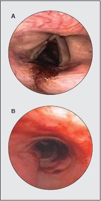Figure 2 – Fiberoptic bronchoscopy revealed old blood at the site of the vocal cords (A) and patchy areas of erythema throughout the bronchial tree (B).