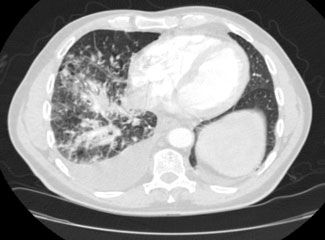 A 61-year-old man with arthritis and an 80-pack-year smoking history presented with fever, dyspnea, and productive cough of a week’s duration that did not respond to outpatient treatment with levofloxacin.