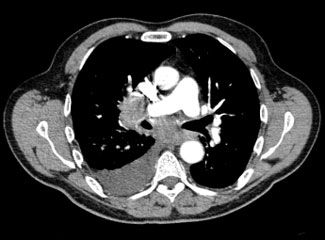 A 61-year-old man with arthritis and an 80-pack-year smoking history presented with fever, dyspnea, and productive cough of a week’s duration that did not respond to outpatient treatment with levofloxacin. He also had worsening arthralgias in both lower extremities, particularly in his knees and ankles, accompanied by a 10-lb weight loss over the 2 months before presentation. Physical examination findings included digital clubbing and decreased breath sounds on the right side with scattered fine rales.
