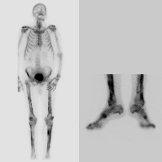 These scintigraphic abnormalities found in the peripheral skeleton are not easily mistaken for diffuse skeletal metastasis. Metastatic tumor almost always involves the central skeleton in an irregular, focal, asymmetric pattern. When long bones are involved, it is the medullary cavity that is primarily affected, as opposed to the cortical involvement seen in HPOA.14,15 After appropriate therapy, the abnormalities seen on radiographic and radionuclide images may diminish or even disappear.