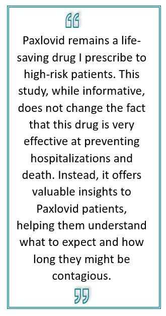"Paxlovid remains a life-saving drug I prescribe to high-risk patients," Jonathon Li, co-senior author on the study, said in a release.2 “This study, while informative, does not change the fact that this drug is very effective at preventing hospitalizations and death. Instead, it offers valuable insights to Paxlovid patients, helping them understand what to expect and how long they might be contagious.”