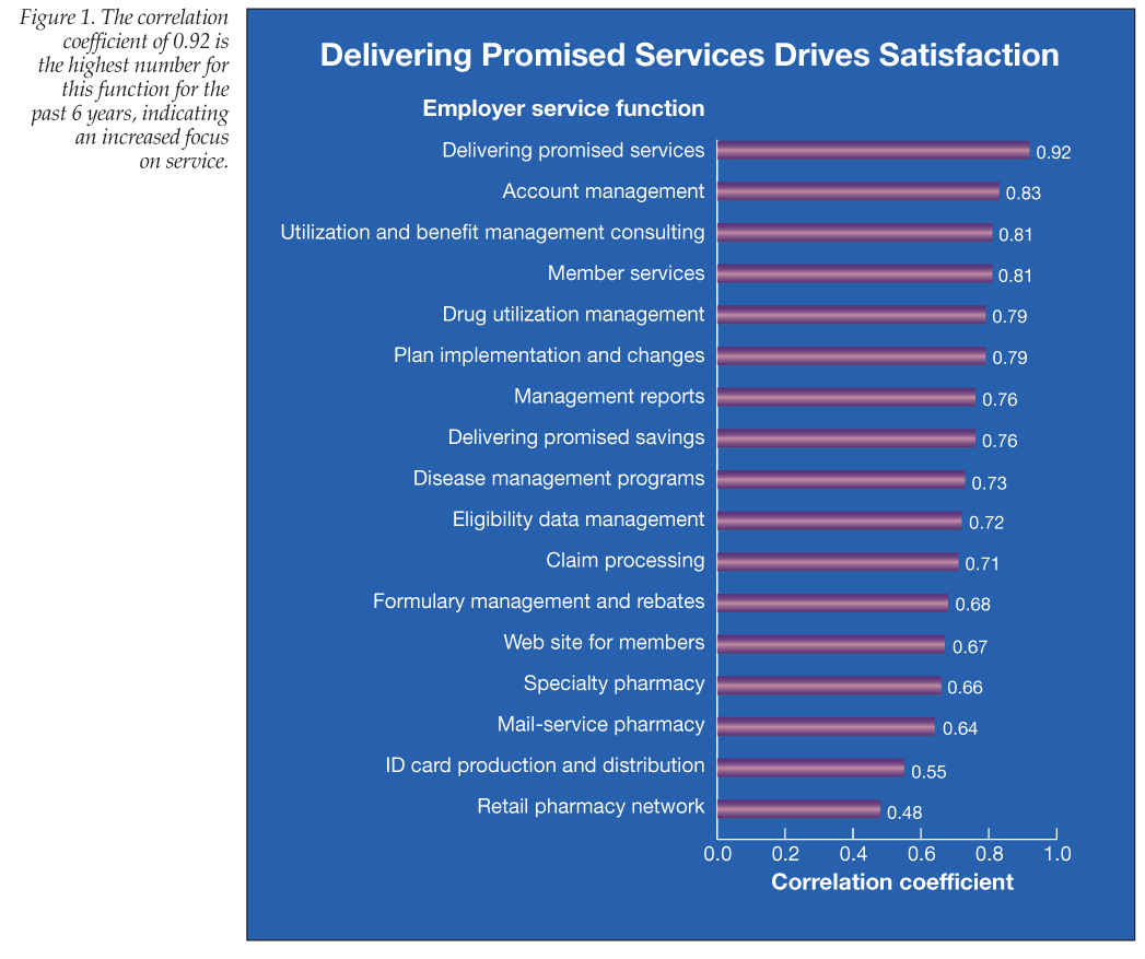 Survey respondents also rated their satisfaction with 18 individual PBM services. The top-rated service is the retail pharmacy network with 9.0, with disease management programs receiving the lowest average rating of 7.2. A correlation analysis was conducted to examine the importance of individual service functions to ratings for overall service and performance. The closer the coefficient is to 1, the stronger the relationship between the variables. Thus, delivering promised services has the greatest impact on overall service and performance, and the retail pharmacy network, although highly rated, has the least impact (Figure 1).