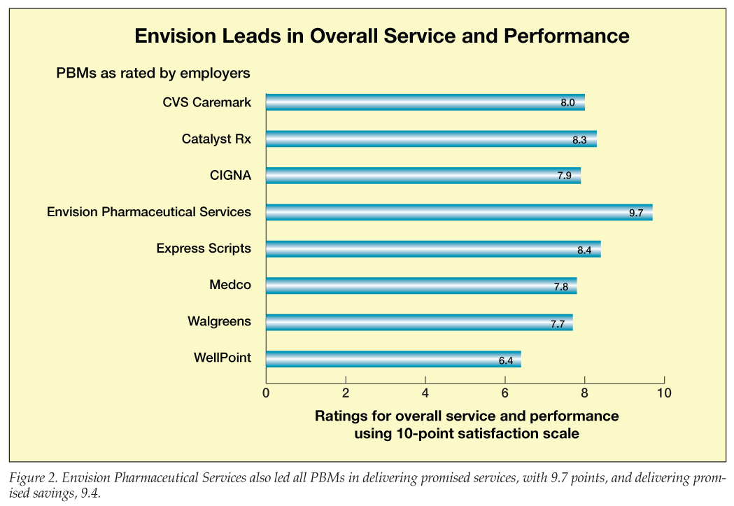 Among individual PBMs, Envision Pharmaceutical Services received the highest average rating by employers of 9.7 (of a possible 10) for overall service and performance, ahead of Express Scripts (8.4) and Catalyst Rx (8.3), which led in 2007 (8.6) and in 2006 (8.4) (Figure 2). Envision also achieved superior ratings for the individual functions of account management (9.7), delivering promised services (9.7), and plan implementation and changes (9.5). Envision’s lowest rating of 8.3 was for disease management programs, although this was well above the 7.2 average for all PBMs.