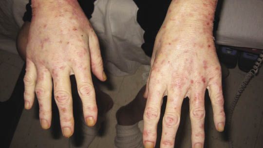 For 4 months, a 45-year-old man with a history of alcohol abuse had made multiple visits to the emergency department (ED) and a dermatology clinic for evaluation of a diffuse, scaly, and intensely pruritic rash. The rash, which was photosensitive, had started on his upper extremities and spread proximally to the trunk and lower extremities.