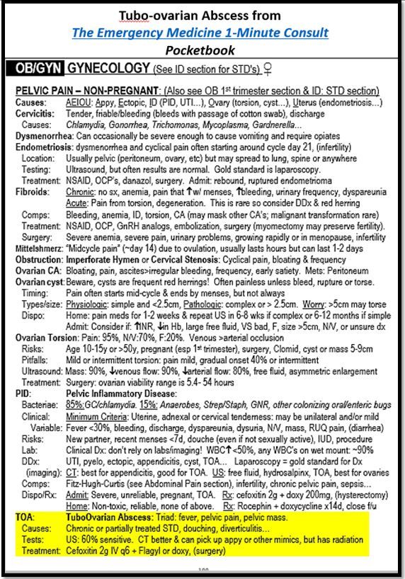 Treatment of TOA is with antibiotics, with surgery reserved for severe or refractory cases. There are many antibiotic regimens that are effective, but whichever is chosen should cover both anaerobes and sexually transmitted infections. One popular regimen is noted in the highlighted area of the Page Shot to the right.