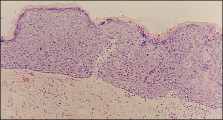 Figure 1 – Biopsy from this case shows architectural failure of maturation throughout the epithelium. Miniscule granular layer produces the thin keratin covering. Subepithelium looks edematous and mildly infiltrated with lymphocytes. (Hematoxylin and eosin stain, original magnification ×100.)